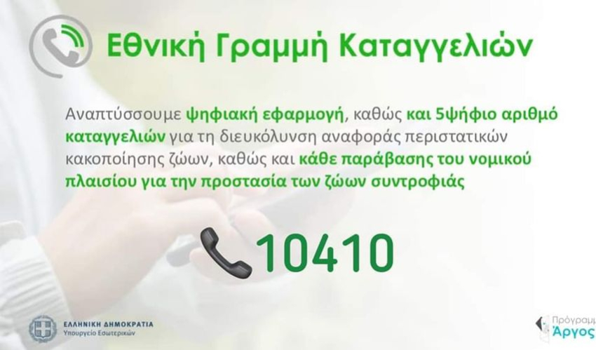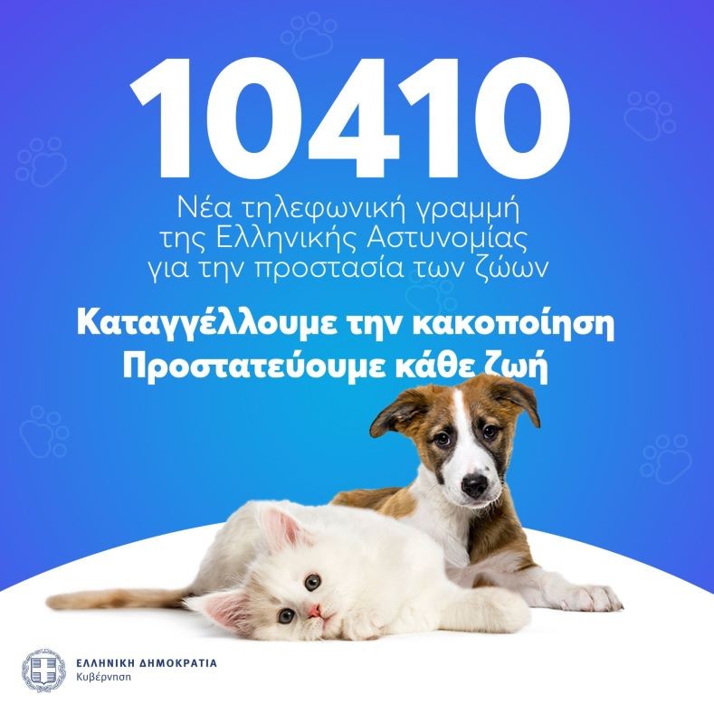Οι πολίτες μπορούν να απευθύνονται στον τηλεφωνικό αριθμό “10410″, ανώνυμα ή επώνυμα, για να παρέχουν πληροφορίες ή να καταγγέλλουν περιστατικά κακοποίησης ζώων, ενώ στην ιστοσελίδα της Ελληνικής Αστυνομίας (www.astynomia.gr) όπου υπενθυμίζεται ότι υπάρχουν χρήσιμες οδηγίες και συμβουλές για την προστασία των ζώων συντροφιάς.