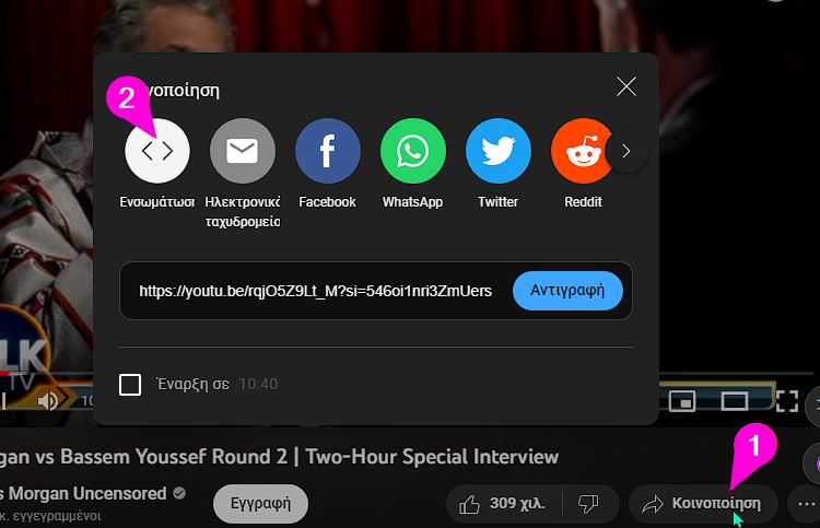 Επίσης, ένας άλλος τρόπος αντιμετώπισης είναι η κοινή χρήση του βίντεο που προσπαθούμε να παρακολουθήσουμε, κάνοντας διαδοχικά κλικ στην Κοινοποίηση > Ενσωμάτωση.