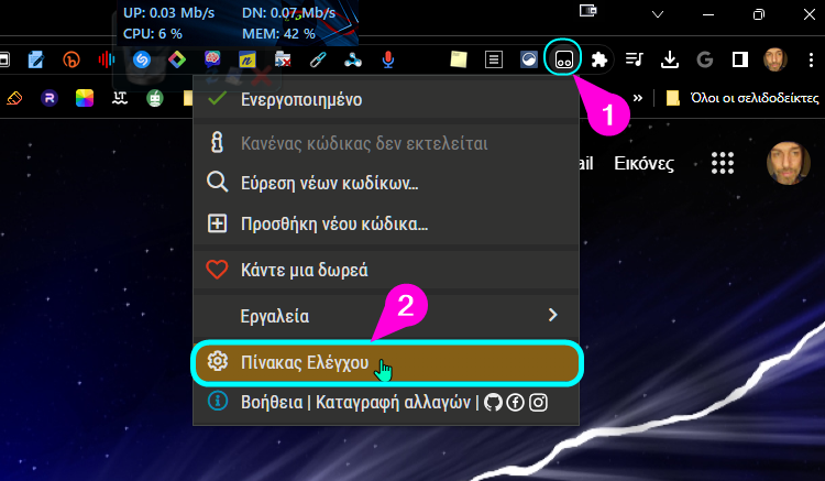 Κατόπιν, πατάμε στο εικονίδιο της επέκτασης στον browser, κάνουμε κλικ στον Πίνακα Ελέγχου…